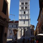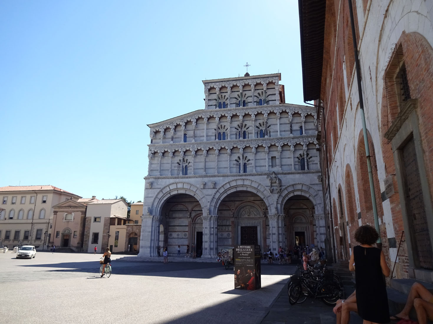 Es waren einige Touristen unterwegs, die sich aber meistens um eine Hauptstraße herum herumtrieben. Wenn man sich etwas weiter davon fortbewegt, wird es einsamer. Ich hatte mir keine Route ausgedacht, schlenderte einfach nur hierhin und dorthin. Ich entdeckte Kirchen, betrat sogar mal eine, hielt mich aber nicht lange auf. Man muss trotzdem genau hinsehen, denn wenn man sie von hinten betrachtet, wo sie nicht mit Marmorfassaden ausgestattet sind, sieht man die Marmorblöcke, die von antiken Gebäuden entwendet worden sind. Warum auch nicht? Die Antike war vorbei, also dienten deren Gebäude nun als Steinbrüche. Und trotzdem kann man hier und da noch die alten Strukturen erkennen. Denn Lucca ist ziemlich schachbrettartig angelegt. So wie eine perfekte Römerstadt. Ich bin mir sicher, dass unter der heutigen mittelalterlichen Stadt noch sämtliche Reste der römischen zu finden sind. Fundamente, Tempel, Wohnhäuser. Das ist es, was Italien so faszinierend macht. Es ist alles irgendwie noch da.