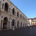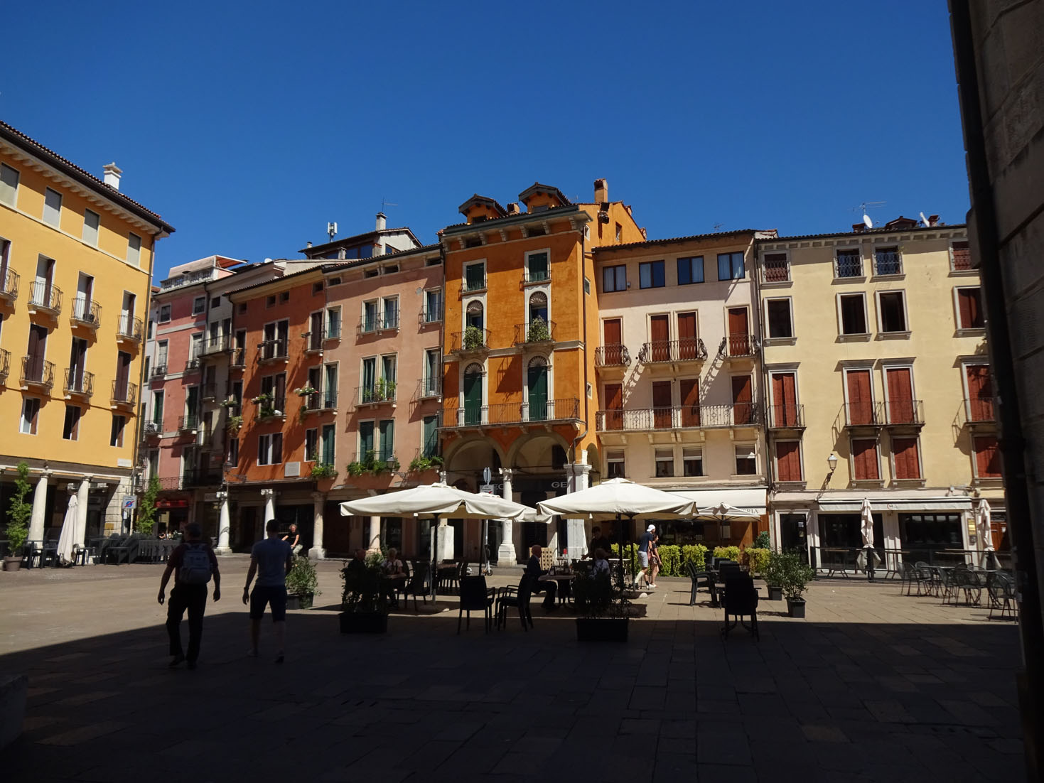 Vicenza mochte ich auf Anhieb. Der Fluss Retrone kommt einem immer mal wieder in die Quere, kleine oder größere Brücken führen herüber. Das Schönste aber sind die Plätze. Den Piazza dei Signori habe ich erwähnt, es ist der Größte, der in den Piazza delle Biade übergeht. Zwei Säulen an seinem Anfang strecken sich in die Höhe, auf einem davon der venezianische Löwe. Ungeahnte Weiten erstrecken sich danach, viel Platz für das Zentrum der Stadt. Prachtbauten an allen Ecken, Kirchen, natürlich der Dom, der ein wenig an eine gigantische Markthalle erinnert. Drin war ich nicht, ich hätte ein Ticket lösen müssen. Zu viele Kirchen. Und überhaupt war mir mehr danach, einfach durch die Stadt zu flanieren. An diesem Sonntag war es einfach. Viele Italiener waren unterwegs, die Restaurants füllten sich später, erst aber die Cafés. Ein Ziel hatte ich nicht, ich ließ mich einfach treiben. Überall standen Informationstafeln. Zu den Dutzenden Palazzi aus Renaissance-Zeiten. Aber auch zu römischen Resten, die kaum sichtbar sind. Die römische Stadt befindet sich unter der jetzigen. Anders als anderswo ist sie tatsächlich fast verschwunden. In Kellergewölben sollen noch Reste zu sehen sein, aber die sind privat. Ein paar Glasplatten zeigen die Grundmauern eines Aquädukts, ich glaube am Corso Andrea Palladino. Es ist kaum etwas zu erkennen. Aber die Stadt ist da. Nur versteckt. Faszinierend.