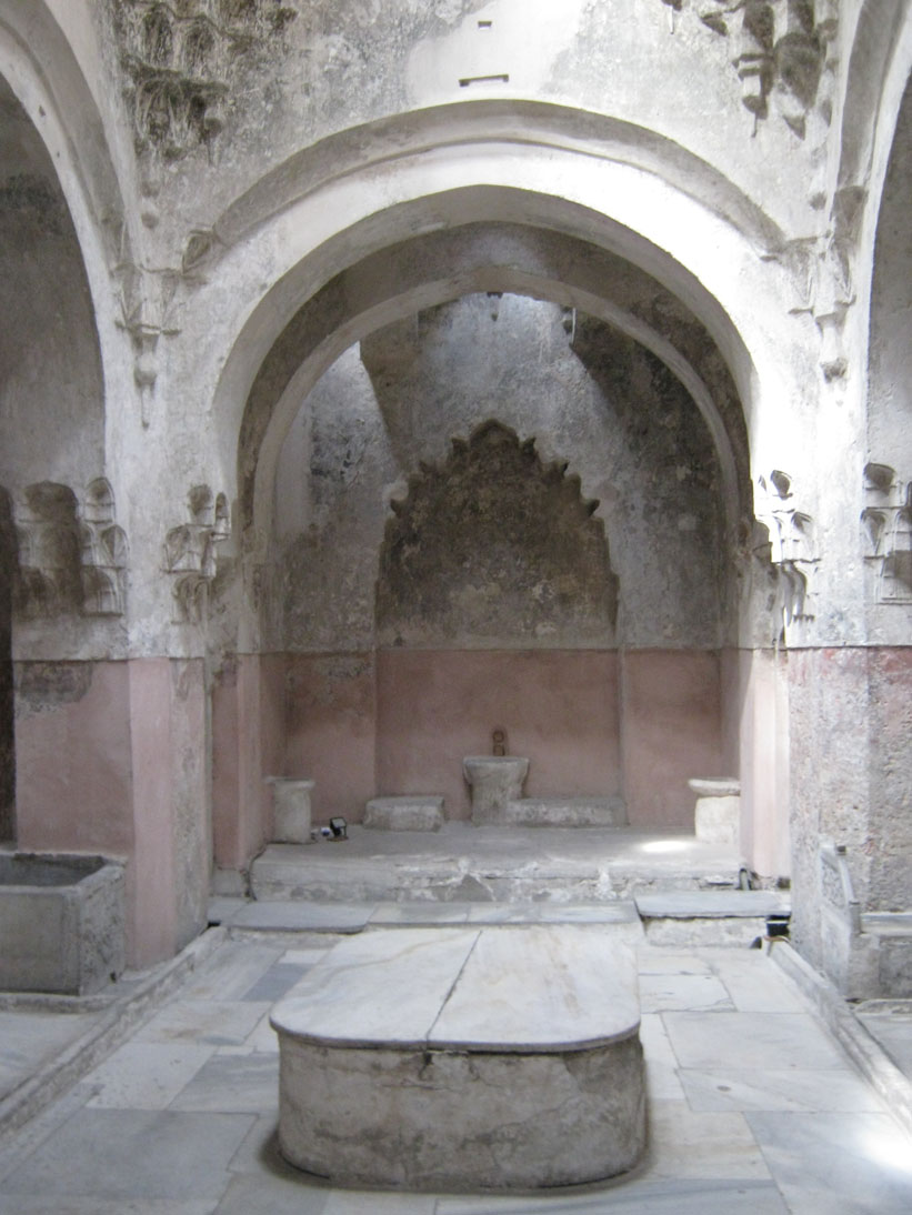Einem Eintrag im Rough Guide zufolge befand sich etwas weiter nördlich davon ein Basar. Dort wollte ich hin, entdeckte dabei die römische Agora, von der nicht mehr viel übrig ist. Wenigstens steht im Osten des Geländes ein kleines Theater, auch wenn das im Vergleich zu dem in Ephesos winzig ist. Den Basar fand ich, Hallen, in denen alles Mögliche verkauft wird. Beinahe leistete ich mir ein Hemd, doch es passte nicht und es war ein Einzelstück. Das war die erste materielle Versuchung seit mehreren Monaten, und sie wurde sofort wieder zunichtegemacht. Meinem Budget tut es gut. Direkt dahinter fand ich den ersten Hamam in Thessaloniki, aus dem 15. Jahrhundert. Für mich beginnt sich der Kreis langsam zu schließen. Den letzten Hamam habe ich in Andalusien gesehen, jetzt komme ich langsam wieder in orientalische Gefilde. Das Gebäude selbst dient als Ausstellungsraum, aber es sind noch viele Originalstücke zu sehen, zum Beispiel marmorne Wannen und Becken. Ich habe mich niemals durchringen können, in Marokko einen Hamam zu besuchen. Vielleicht schaffe ich es in der Türkei.