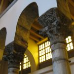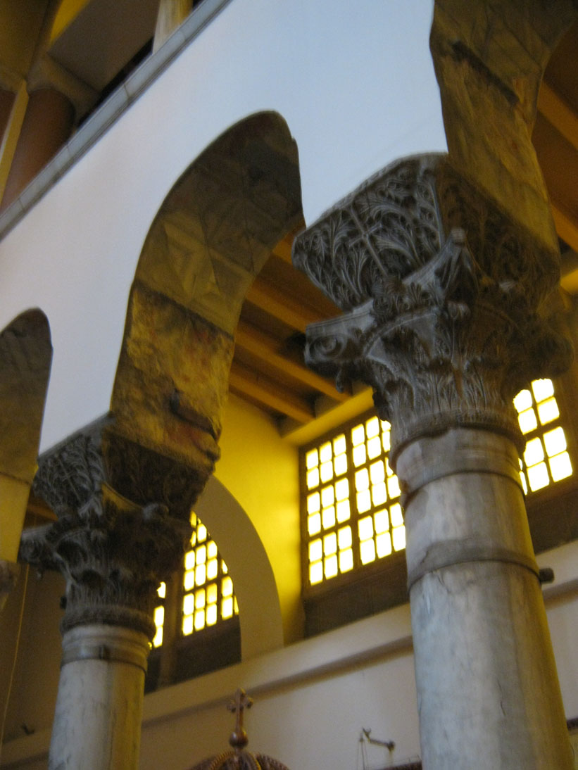 Die Kirche selbst faszinierte mich, wahrscheinlich aus den falschen Gründen. Wie bereits gestern in der Akropolis bewunderte ich die antiken Bauteile, keine Säule glich der anderen, wüst zusammen geklaut und wieder verwertet. Auch die Kapitelle sind zum Teil antik, römische korinthische Säulen sah ich am häufigsten. Insgesamt gefiel mir die Atmosphäre in der Kirche. Die Jungfrau Maria in der Kuppel des Chors lächelte übrigens ein wenig, zumindest sah es so aus. Es ist ein nicht eindeutiger Gesichtsausdruck, denn von einem anderen Blickwinkel aus schien sie wieder zu leiden. Doch die ganz leicht nach oben gezogenen Mundwinkel geben ihr etwas Zufriedenes, was man eigentlich bei einer Mutter mit ihrem Kind auf dem Schoß auch erwarten kann.
