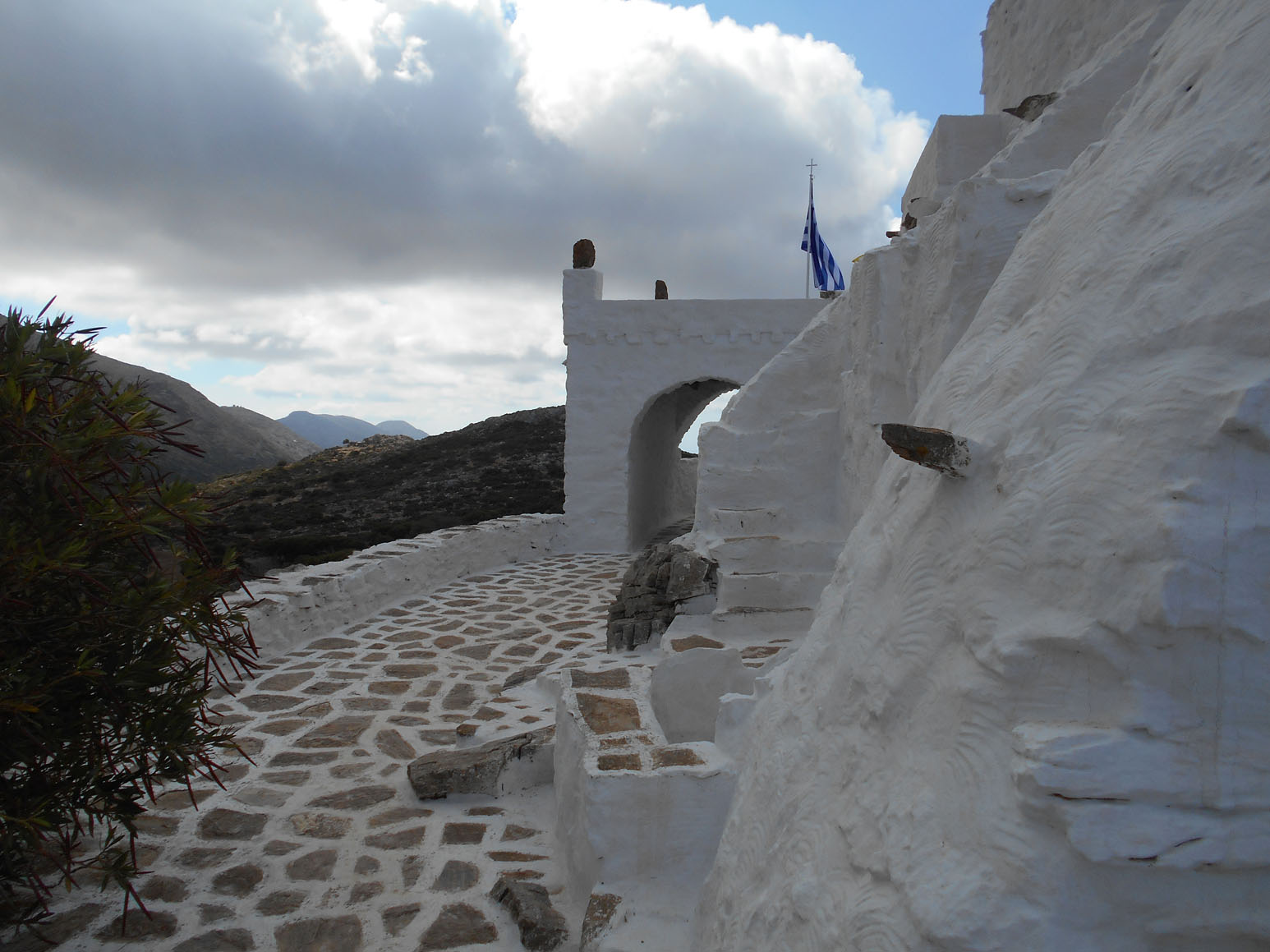 Ein prachtvoller flacher Bau, schief gebeugt, Dutzende Male geweißt, mit dicken Steinmauern und unebenem Putz. Ein typisches Ziel einer kykladischen Wanderung.