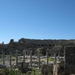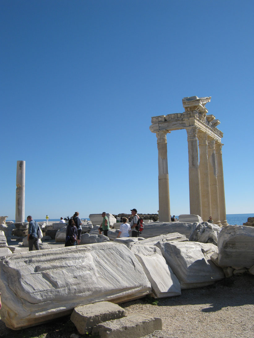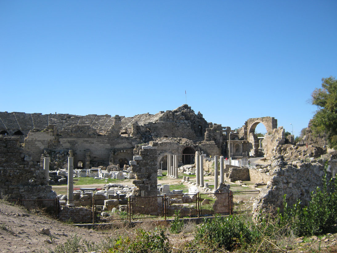 Auch wenn der Rough Guide nicht viel versprach, machten wir uns auf, um die antiken Stätten der Stadt Side zu sehen. Laut Führer handelt es sich um ein Ressort übelster Art. Begrüßt jedoch wurden wir von einer stattlichen Stadtmauer aus römischer Zeit, die sich gegen die zernagende Zeit behauptet hat. Allen Unkenrufen zum Trotz sahen wir noch kein Ressort. Unser Spaziergang führte uns an den Ruinen antiker Shops vorbei, die alte Stadt lag dahinter noch vergraben unter dem Sand neben der Straße. Ab und an ragten halb eingestürzte Wände hervor. So muss es früher in Italien ausgesehen haben, im siebzehnten oder achtzehnten Jahrhundert, als die imperialen Bauwerke versunken zwischen der Vegetation hervorstachen und die besuchenden Künstler verzauberten. Experten werden die Kupferstiche kennen, von denen ich rede. So ähnlich sieht es in Side aus. Wir erreichten das Theater, wo auch die moderne Stadt begann. Hier erkannten wir den Ort, der im Rough Guide beschrieben ist. Ein Touristengeschäft reiht sich an das nächste, überall stehen „Touts“ und versuchen, Leute in die Läden oder Restaurants zu ziehen. Es war nicht gerade angenehm, denn im Abstand von wenigen Metern wurden wir angesprochen, was einem ruhigen Spaziergang durch die Stadt abträglich ist. Nachdem wir uns etwas gestärkt hatten, besuchten wir das Theater. Ich war erstaunt, denn es ist meines Erachtens sehr sorgfältig restauriert. Teile der Bühne sind erhalten, das ist selten, so dass der Eindruck vom Bauwerk sehr stark war. Die türkischen Archäologen haben darauf geachtet, das Theater nicht zu verschandeln. Antike Sitzbänke wurden durch Beton in ähnlicher Farbe ergänzt, wenn notwendig, so dass man sieht, was echt ist und was nicht. Herausgekommen ist ein Bauwerk, von dem man eine Ahnung bekommt, wie es einmal ausgesehen hat. Und das ist die Hauptsache.