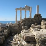 Nach der Besichtigung des Theaters liefen wir weiter, in die halb versunkene Stadt hinein. Wir trafen auf den Bischofspalast, der noch nicht ganz ausgegraben ist. Danach folgten wir einem Trampelpfad, der uns zwischen die Ruinen führte. Irgendwann stiegen wir eine Treppe zum Strand hinab, die antike Stadt ist halb ins Meer gestürzt, überall liegen Säulenteile und andere Mauerstücke zwischen den Dünen. Mich begeistern solche Anblicke.